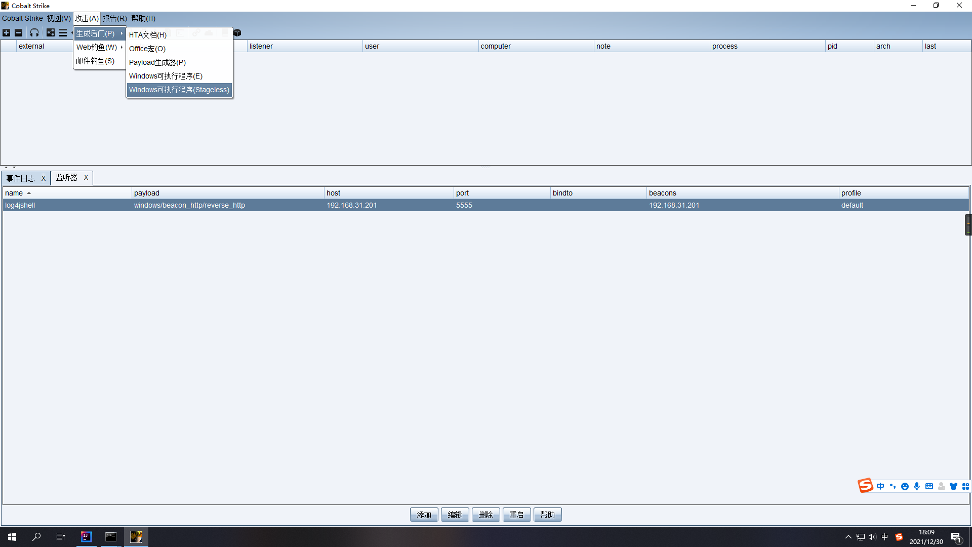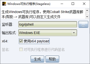 点击攻击 –> 生成后门 –> Windows可执行程序Stageless