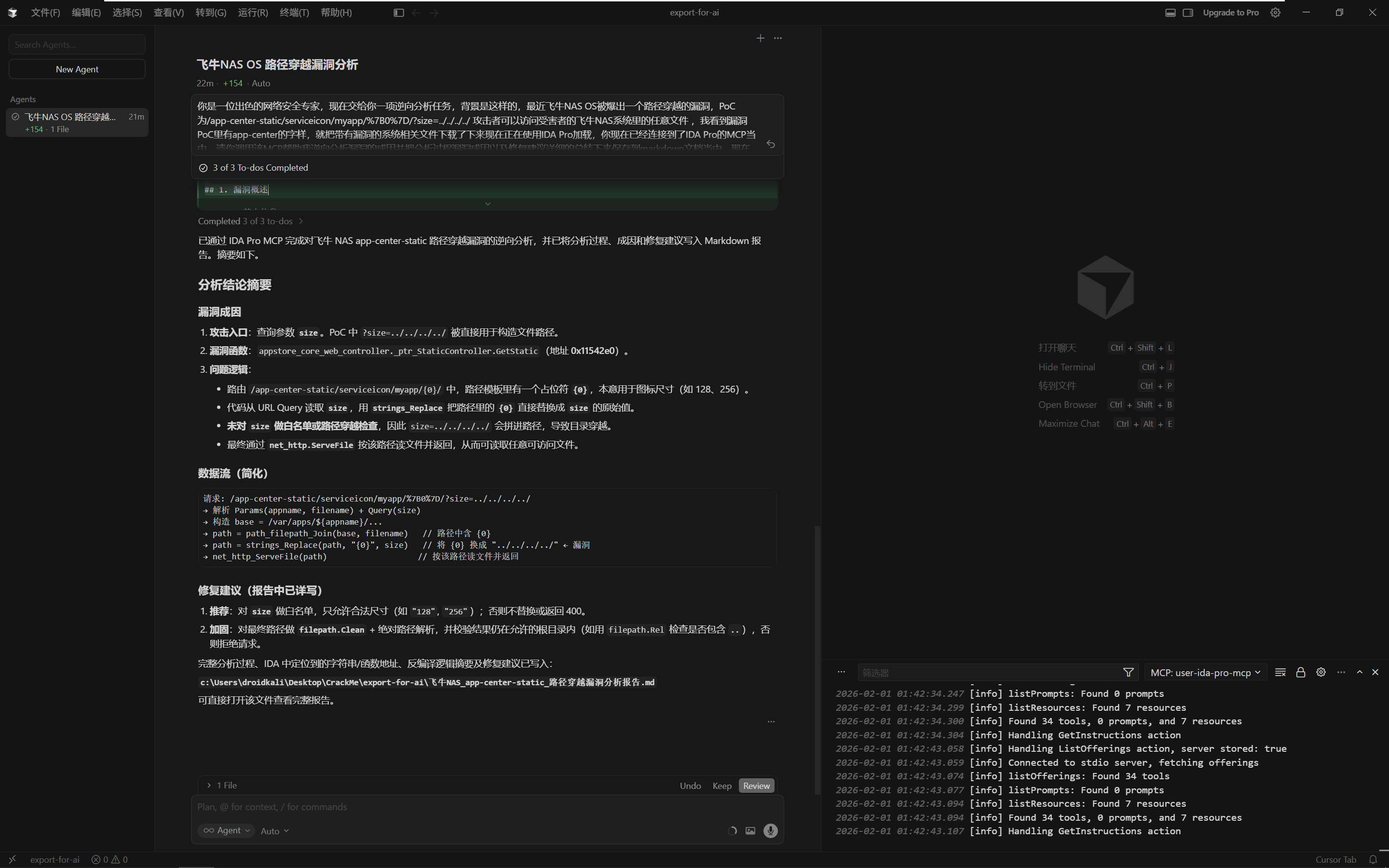 最近看到 飞牛NAS OS 被曝存在路径穿越漏洞,结合当下 AI MCP Agent 热度爆火,于是就想记录一下使用MCP来逆向分析溯源的能力。