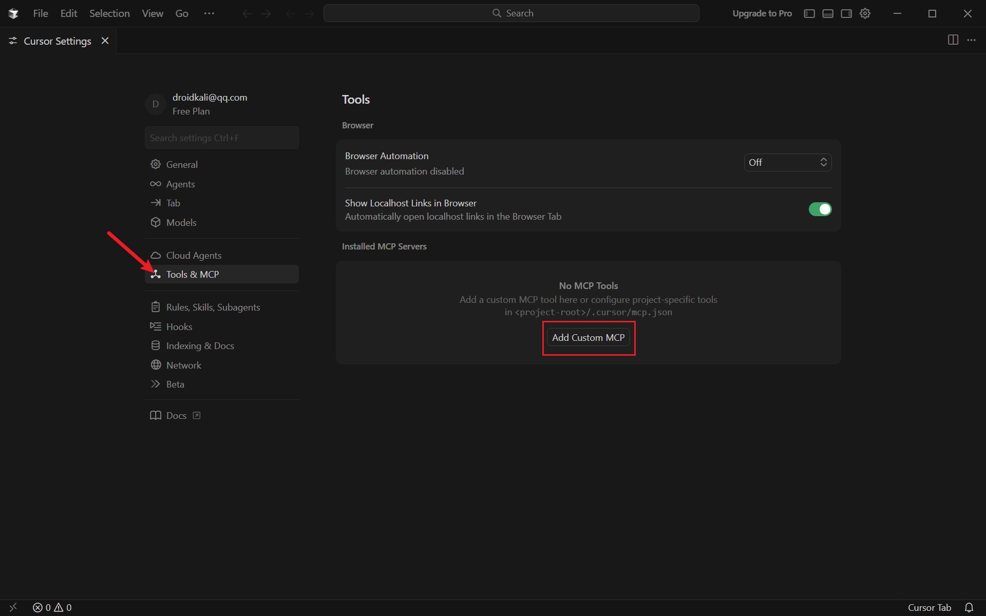 找到 Tools & MCP 在右边 Installed MCP Servers 下点击 Add Custom MCP
