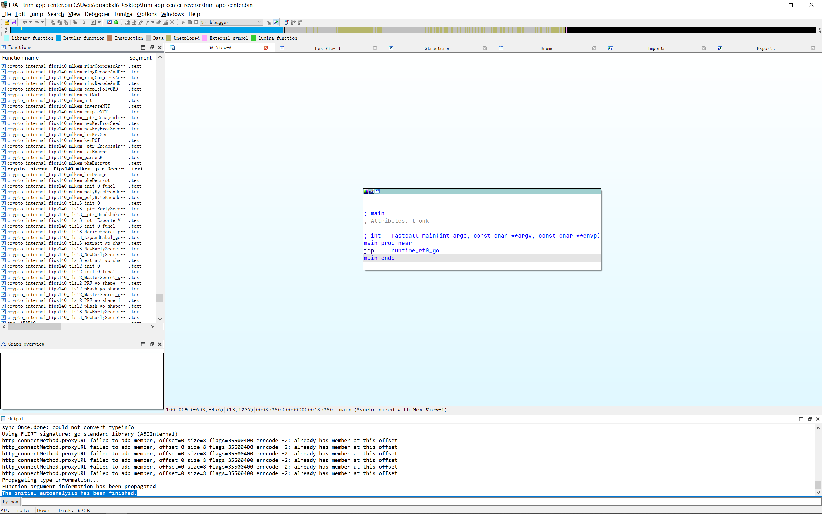79dab1f0bdcf047c3d4be6115076c527e3f96888012eb6978f0e776786c17ce0 trim_app_center我们打开 IDA Pro 来加载这个程序