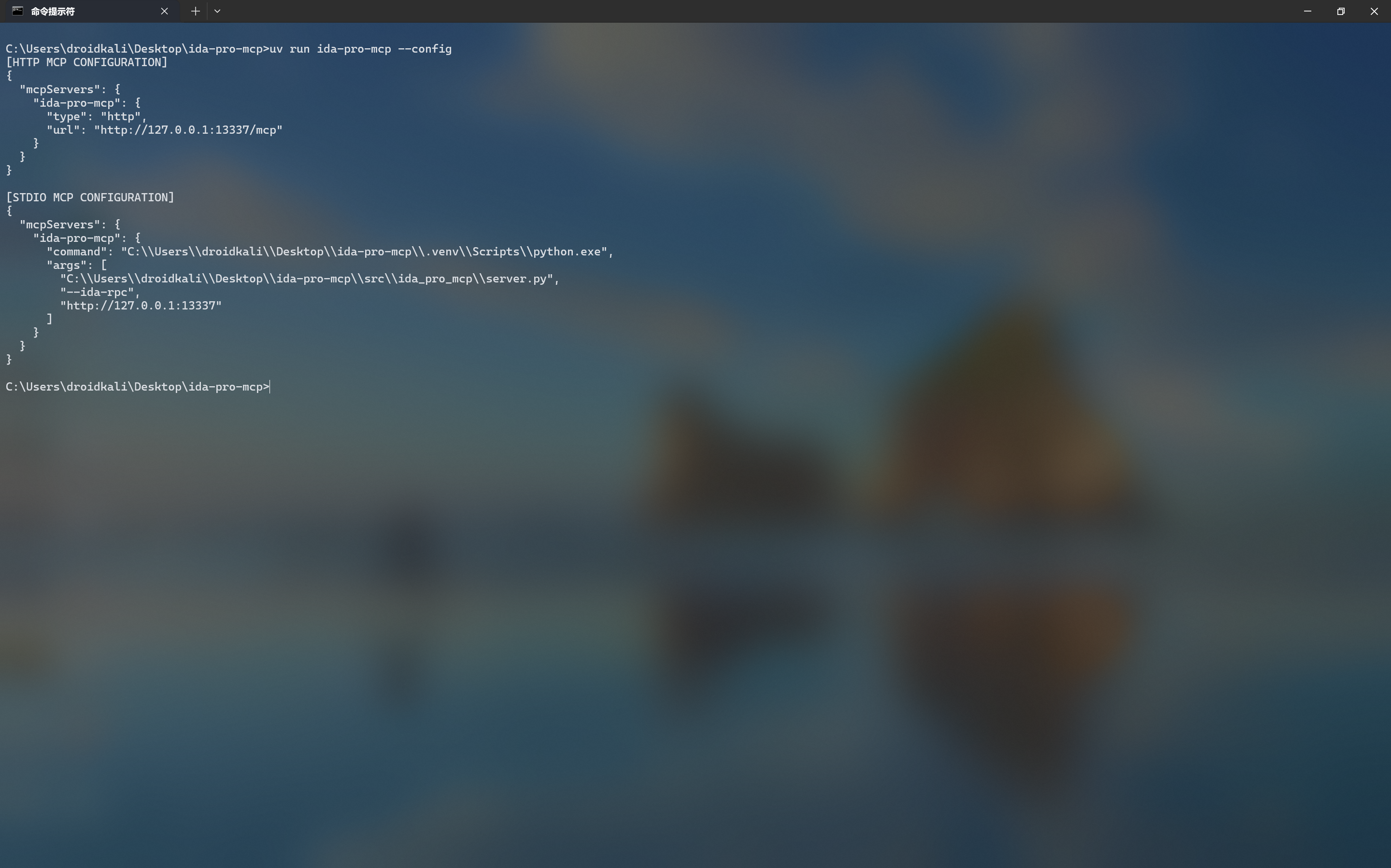 uv run ida-pro-mcp --config复制 [STDIO MCP CONFIGURATION] 下面的内容 我这里的json内容是