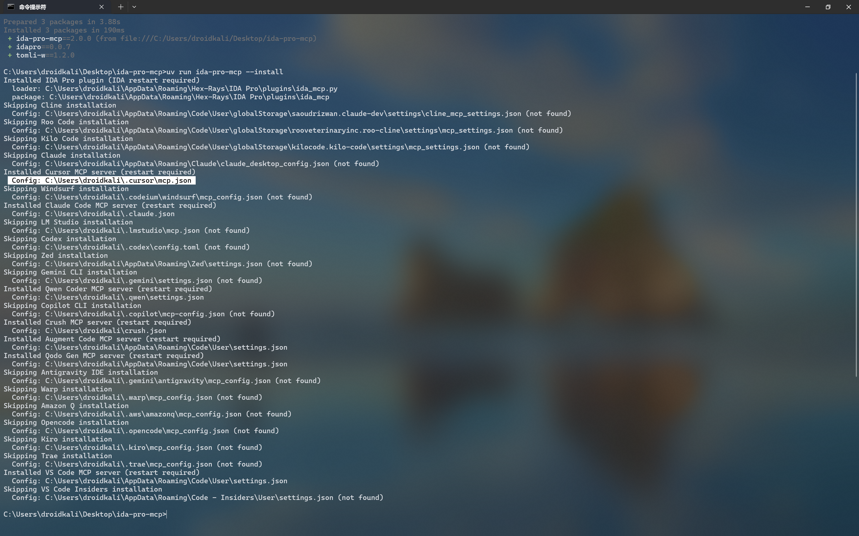 uv run ida-pro-mcp --install运行这条命令会自动将IDA Pro MCP插件复制到 C:\Users\<你的用户名>\AppData\Roaming\Hex-Rays\IDA Pro\plugins 目录当中,同时也会自动检测系统中已安装的AI IDE并自动将MCP json配置文件复制到对应的AI IDE配置文件夹当中。