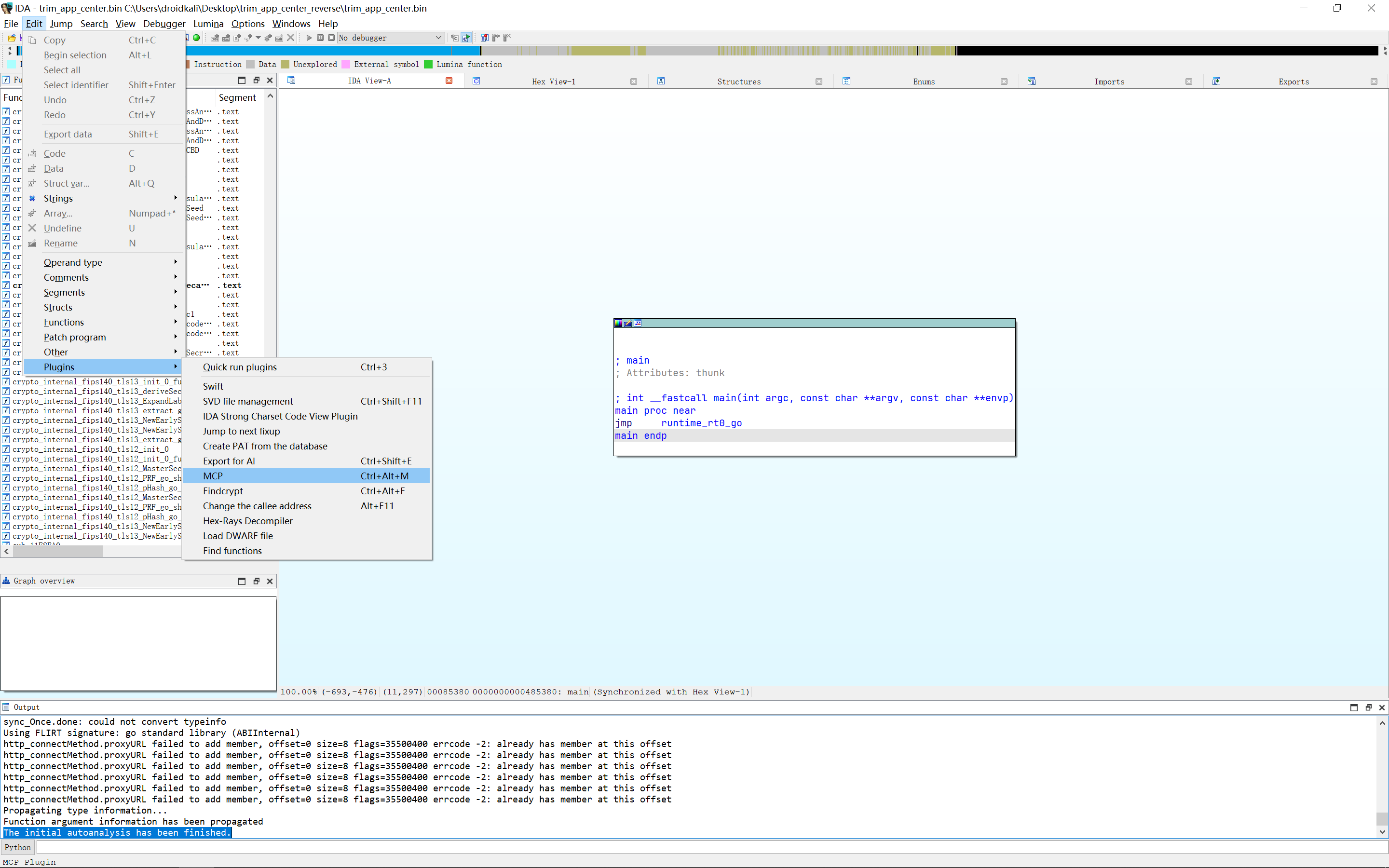 等待 IDA Pro 加载完成, 接着我们点击左上角的 Edit –> Plugins –> MCP Ctrl+Alt+M